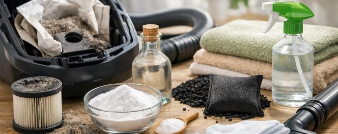 Bicarbonat de sodiu: Presărați o cantitate mică pe podea și aspirați. Soda este un adsorbant excelent și neutralizează mirosurile acide.