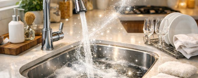 O chiuvetă curată și uscată face vizual ca întreaga bucătărie să pară ordonată, creând un efect de ordine chiar și în prezența altor imperfecțiuni minore.