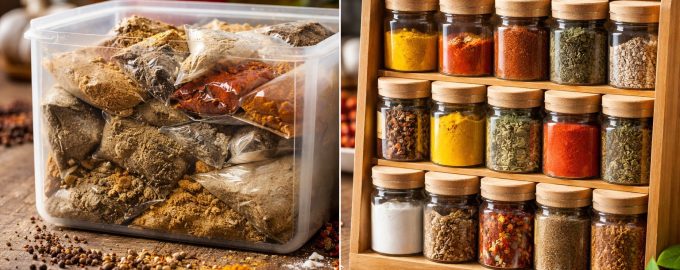 Pentru a păstra autenticitatea gustuluiDacă condimentele trebuie păstrate în propriul lor spațiu etanș, fiecare tip de condiment trebuie păstrat în propriul său spațiu etanș. Sunt ideale borcane mici de sticlă cu capace bine închise sau, cel puțin, pungi ziplock individuale. Acest lucru creează mediu izolatîn care uleiurile esențiale rămân în interiorul produsului și nu se volatilizează în aer.