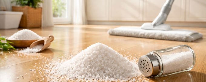 O altă problemă frecventă la curățarea pardoselilor sunt petele neplăcute pete albicioasecare sunt lăsate în urmă atunci când apa sau produsele cu săpun se usucă. Sarea ajută să înmoaie apa