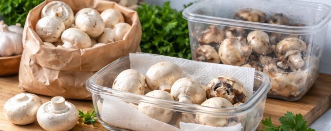 Pungile de plastic și recipientele fără ventilație sunt distructive. Ciupercile eliberează umiditate atunci când respiră, iar în plasticul etanș se formează condens, accelerând deteriorarea. Opțiunea ideală este să pungă de hârtiecare absoarbe excesul de umiditate și permite alimentelor să respire. Dacă hârtia nu este disponibilă, se poate folosi un recipient din plastic, acoperit cu un prosop uscat în loc de capac.