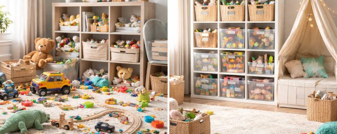 Nu trebuie să țineți toate bogățiile la vedere în același timp. Psihologii și organizatorii de spațiu recomandă sistemul de rotațieLăsați doar o cantitate mică disponibilă și depozitați restul pe un mezanin sau într-un dulap. O dată pe lună, rotiți seturile. Acest lucru creează un efect de noutate, menține interesul copilului și, cel mai important, reduce semnificativ numărul de articole care trebuie să fie puse deoparte în fiecare seară.