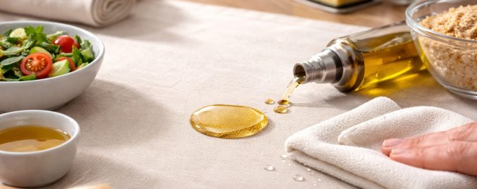 La prima e principale regola per trattare le macchie d’olio è. velocità di reazione. Non appena una goccia d’olio è presente sul panno, non bisogna mai strofinarla per non spingere il grasso in profondità. Invece, tamponare delicatamente l’area con un tovagliolo di carta asciutto per rimuovere l’olio in eccesso.