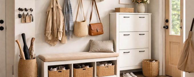 La soluzione ideale è un bel vassoio o una ciotola decorativa. Quando i piccoli oggetti vengono riposti in un contenitore apposito, sembrano un elemento decorativo piuttosto che rifiuti sparsi. Usate il vimini per sciarpe, cappelli e guanti cestini o scatole identiche da posizionare sul ripiano superiore. L’uniformità dei contenitori è un fattore chiave per creare un aspetto ordinato.