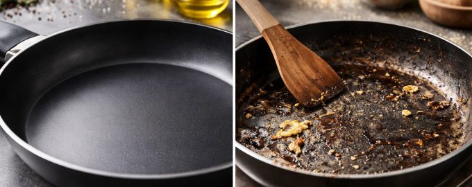 I moderni materiali antiaderenti non tollerano le alte temperature di „inattività”. Se una padella viene lasciata a fuoco alto senza cibo o olio anche solo per 2-3 minuti, il rivestimento comincia a a rompersi a livello molecolare