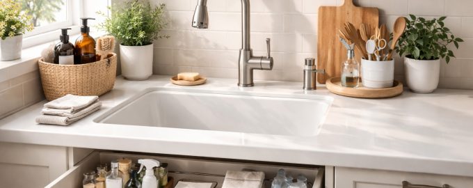 Il lavello della cucina è uno dei principali „punti caldi” dell’appartamento, dove si formano istantaneamente rumore visivo. Bottiglie colorate, spugne bagnate e spazzole sparse a caso creano una sensazione di disordine, anche se il resto della cucina è pulito. Una corretta organizzazione di questa piccola area può cambiare radicalmente la percezione dell’intero ambiente e rendere molto più facile mantenere l’ordine. pulizia quotidiana.