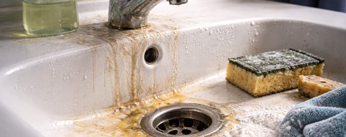 In cucina, questo elenco è completato da pellicola di grasso. Anche se si sciacqua accuratamente il grasso dopo aver lavato i piatti, le microparticelle di olio possono depositarsi sulle pareti del lavandino. Il grasso è idrofobo, ma è eccellente nel legare i depositi minerali e i residui di cibo, creando uno strato spesso e incolto che si scurisce nel tempo e diventa un terreno fertile per i batteri.
