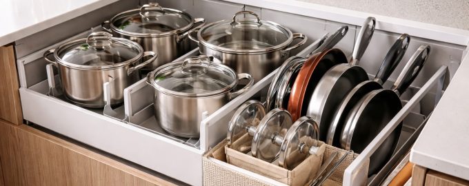 Un astfel de organizator poate fi pus direct într-un sertar adânc sau pe raftul unui dulap. Fiecare tigaie sau oală plată ocupă propria celulă, fără a se atinge de vecinii săi. Acest lucru garantează integritatea acoperirii și acces instantaneu la elementul dorit, fără zgomot inutil.